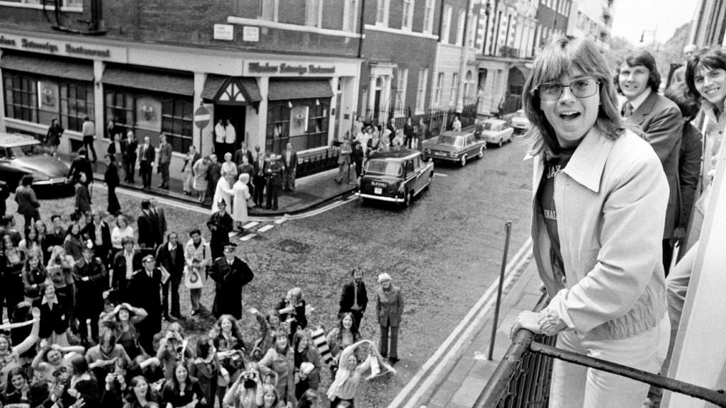 American pop idol David Cassidy arrived through the back door of Radio Luxembourg while his fans waited in the rain at the front of the building. But not to disappoint his fans, David made two appearances on the balcony overlooking Hertford Street where the traffic had been stopped by the massed fans, May 23, 1974. Photo by Peter Stone/Mirrorpix/Getty Images
