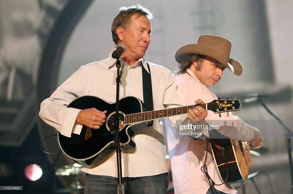 LAS VEGAS – MAY 22: Musician Buddy Alan Owens (L), Buck Owens son and Dwight Yoakam perform onstage during the rehearsals for the Buck Owens tribute at the Academy of Country Music Awards held at the MGM Grand Garden Arena on May 22, 2006 in Las Vegas, Nevada. (Photo by Kevin Winter/Getty Images)